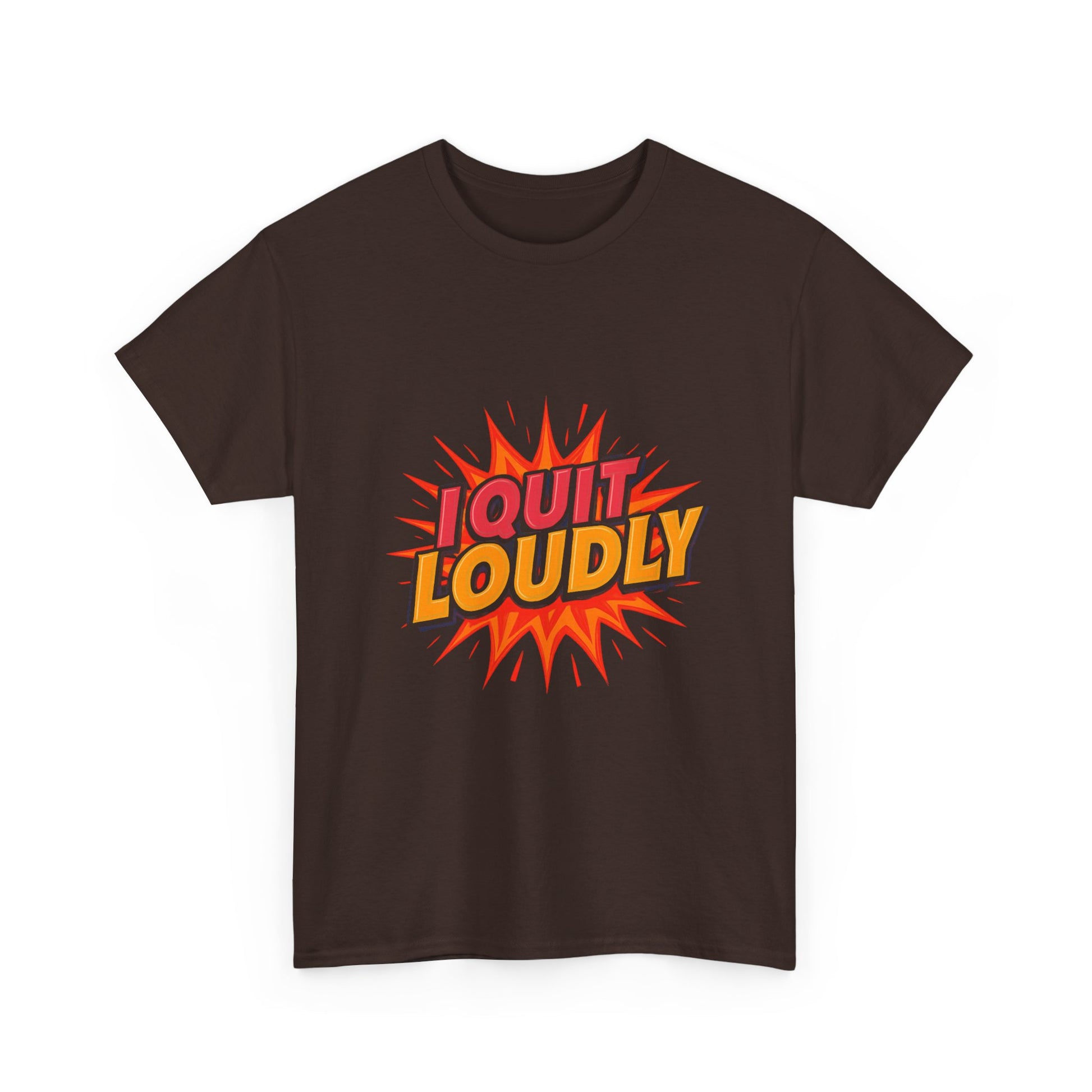 Meet quiet quitter's older sibling. This tee carries a bold, playful energy, bright burst graphics and retro lettering that read “I QUIT LOUDLY.” It feels like stepping out of a cubicle and into sunlight: loud, unapologetic, and a little rebellious. The relaxed crew-neck silhouette sits comfortably on the shoulders, letting the graphic take center stage without being fussy. Wear it when you need to announce a change, celebrate a boundary, or simply add a pop of confident color to a slow Saturday. The soft, sturdy cotton holds the print crisp and vivid, while the tear-away label and reinforced shoulder tape keep the fit comfortable all day. It’s for people who want their wardrobe to speak up as much as they do.